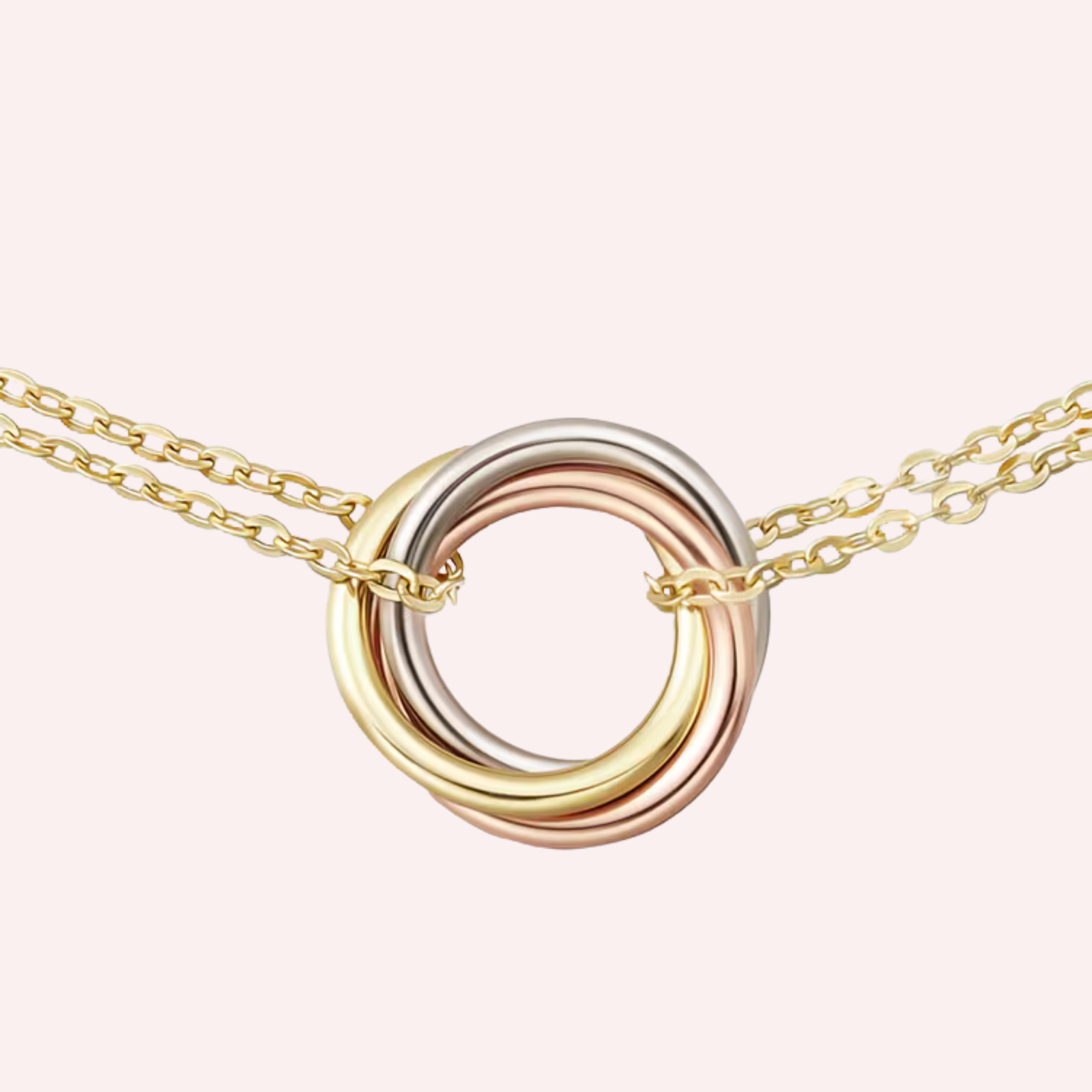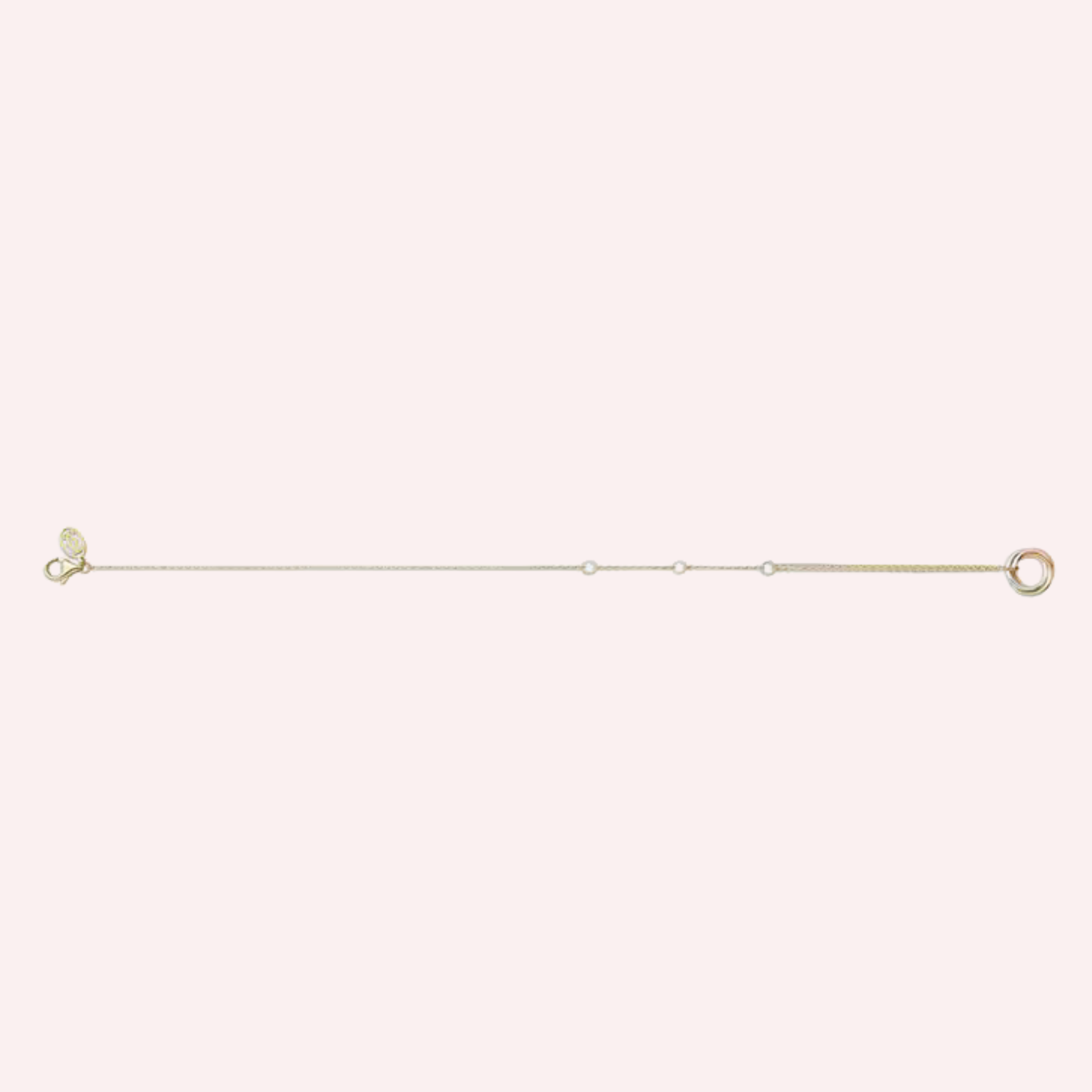 Expertly crafted in a harmonious trio of 18K white gold, 18K rose gold, and 18K yellow gold (750/1000), the bracelet features three intertwined moving rings suspended from an elegant 18K yellow gold chain. The inner diameter measures 10.7 mm, offering a refined yet distinctive presence on the wrist. The adjustable chain allows for a perfect fit with lengths of 13–14–15 cm (for size 15) and 16–17–18 cm (for size 18), ensuring versatile and comfortable wear.