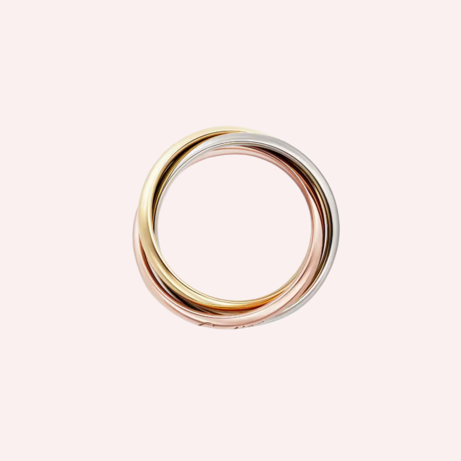 Expertly crafted in 18K white gold, 18K rose gold, and 18K yellow gold, this medium model features three perfectly balanced bands that move gracefully against one another. Each ring has a refined width of 3.2 mm (for size 52), creating a harmonious silhouette that is both elegant and substantial. The design reflects Cartier’s mastery of proportion, movement, and enduring craftsmanship, making it a classic expression of sophistication and style.