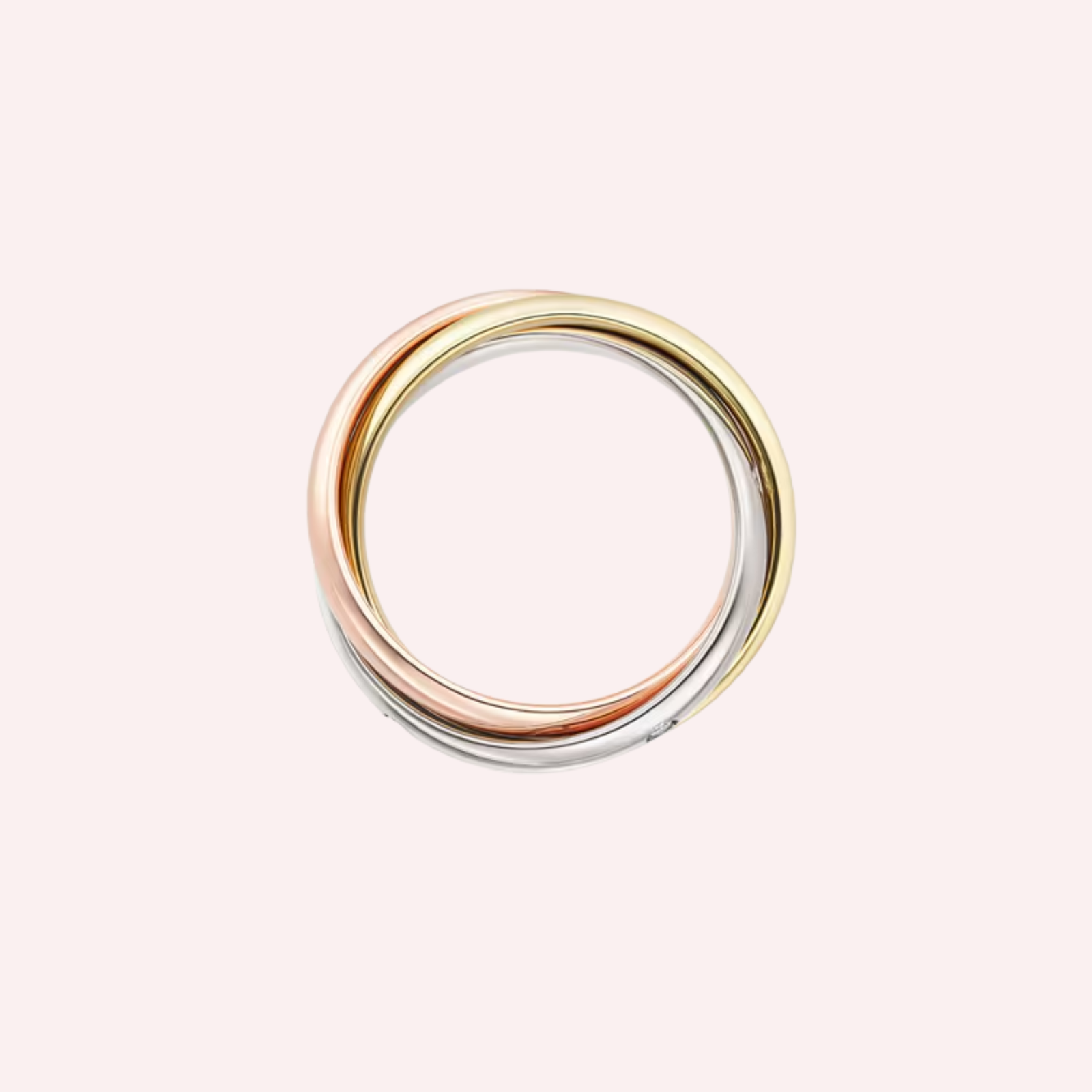 Expertly crafted in 18K white gold, 18K rose gold, and 18K yellow gold (750/1000), this medium model preserves the elegance and balance of the original design while introducing a subtle touch of brilliance. One band is delicately set with five brilliant-cut diamonds totaling 0.06 carats, offering refined sparkle without disrupting the ring’s iconic simplicity. With a width of 3.2 mm per band (for size 52), the ring presents a harmonious silhouette that blends understated luxury with Cartier’s exceptional craftsmanship.