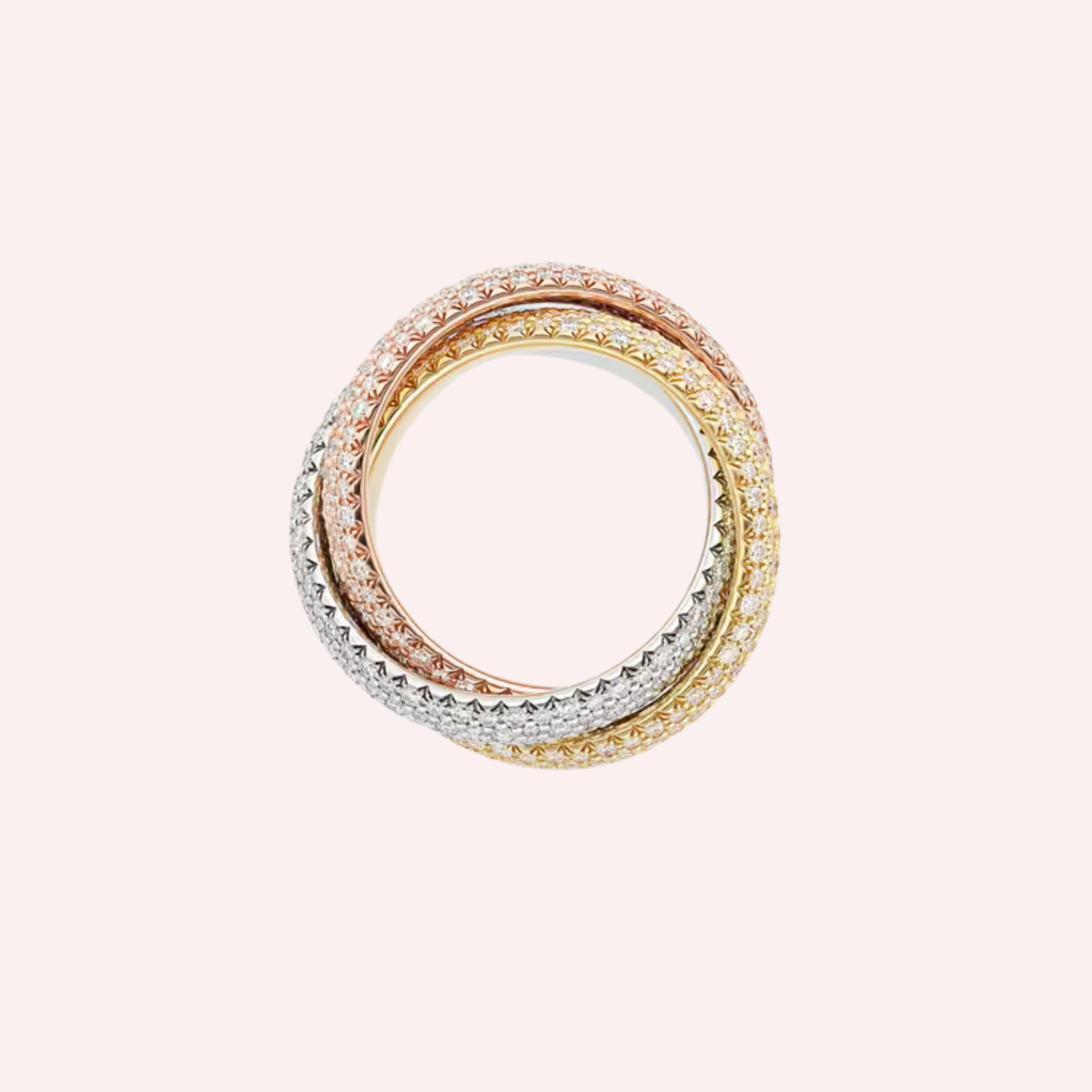 A Pre-Owned Cartier Trinity large pavé ring in white, rose, and yellow gold, set with 600 brilliant-cut diamonds totaling 3.02 carats.