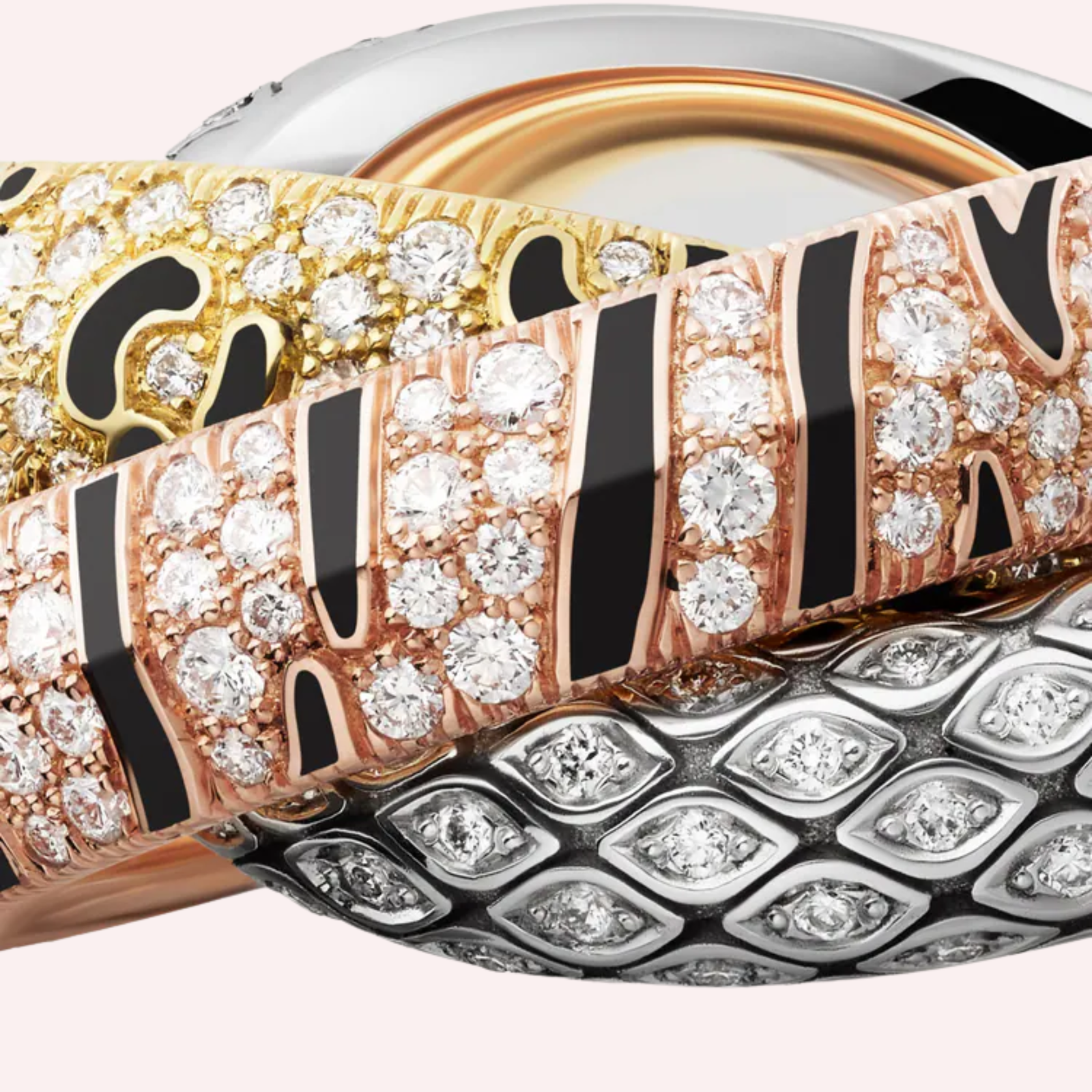 Expertly crafted in a harmonious combination of 18K white gold, 18K rose gold, and 18K yellow gold (750/1000), this two-finger design elevates the classic Trinity concept with dramatic black lacquer accents. The sculptural composition is further enhanced by a pavé setting of 428 brilliant-cut diamonds totaling 1.82 carats (for size 52), creating a powerful contrast between luminous sparkle and deep, graphic lacquer. Designed to span two fingers, this statement piece exemplifies Cartier’s mastery of form, movement, and contemporary elegance.