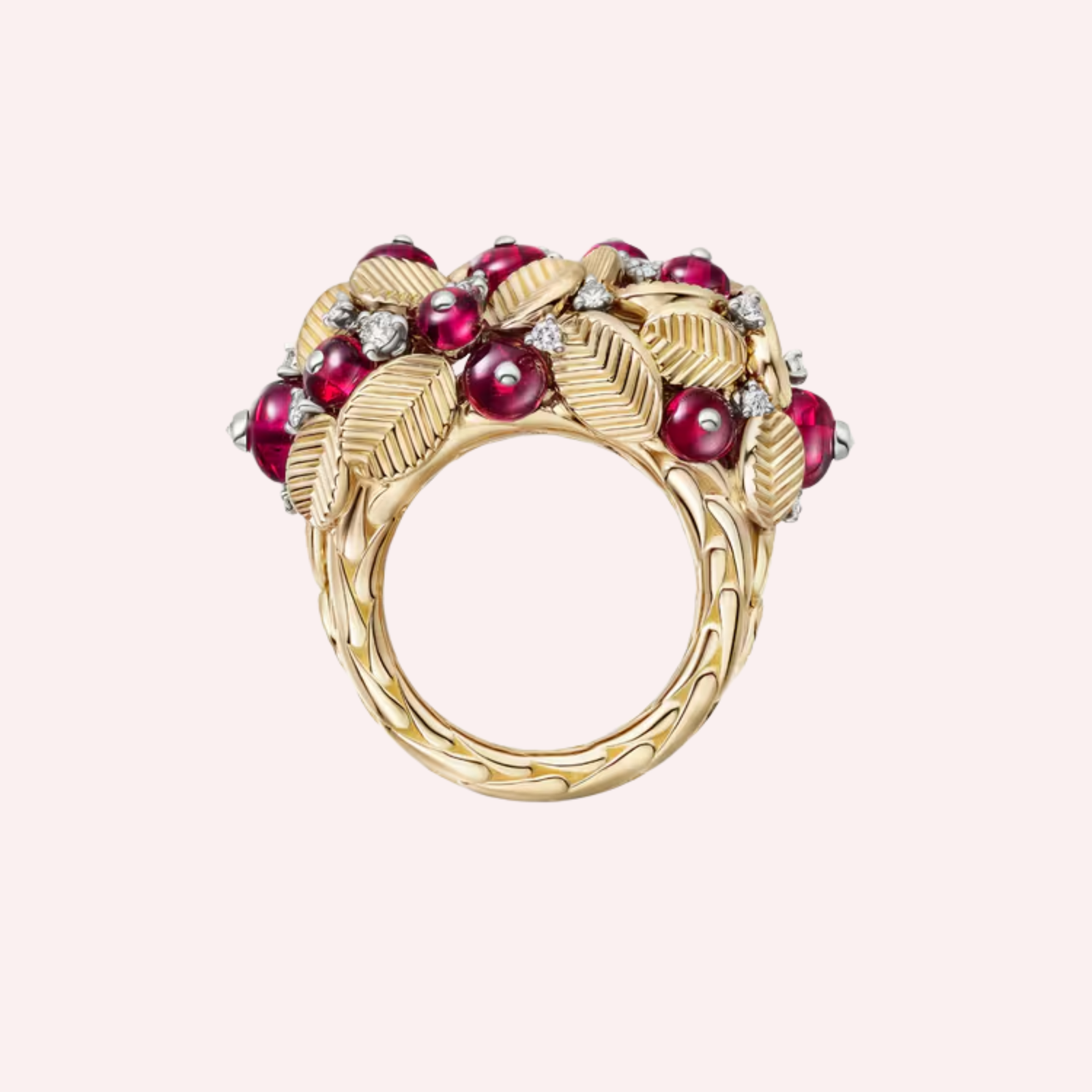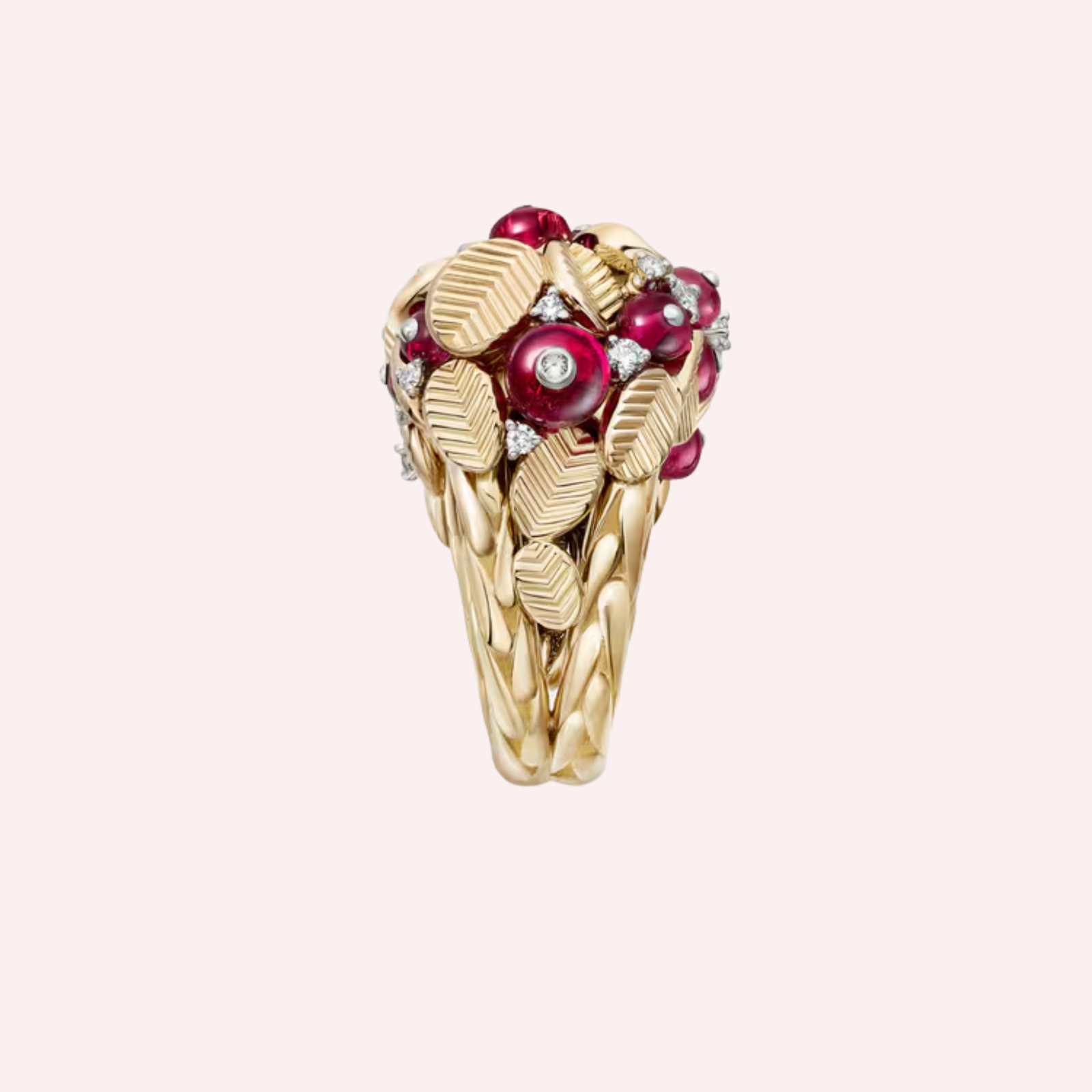A Pre-Owned Cartier Grain de Café semi-pavé ring in 18K yellow gold and platinum, set with rubellites and brilliant-cut diamonds.