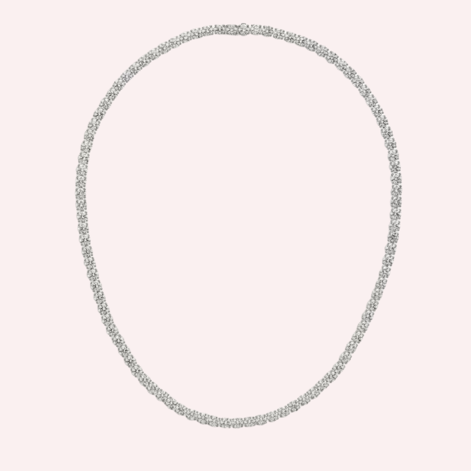 Crafted in prestigious platinum (950/1000), this high jewelry necklace is set with 91 brilliant-cut diamonds totaling an impressive 23.67 carats. Meticulously aligned, the diamonds create a continuous ribbon of light that enhances the necklace’s sculptural clarity and radiant presence. Understated yet commanding, this piece stands as a masterful statement of Cartier’s expertise in diamond setting and its enduring legacy of modern luxury.
