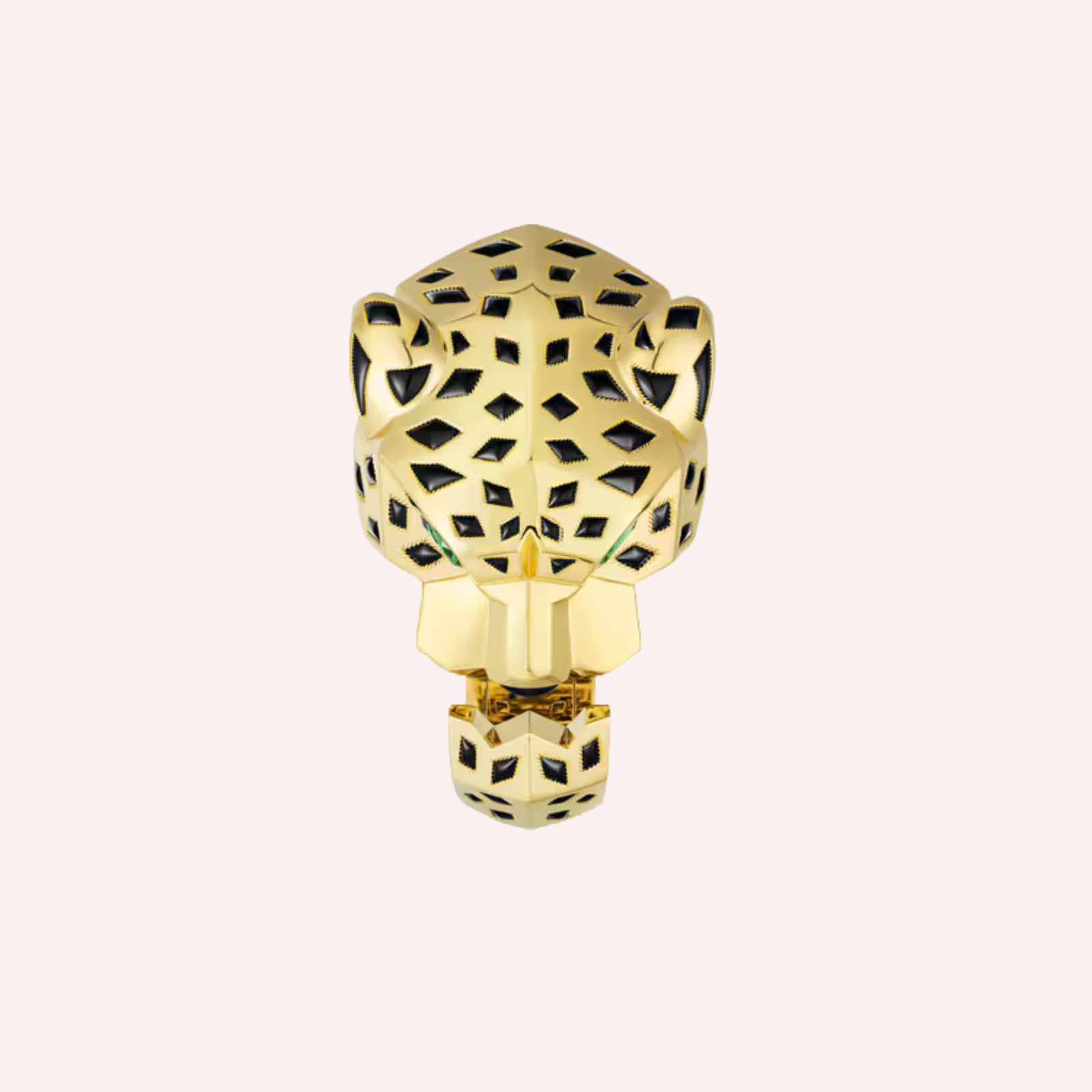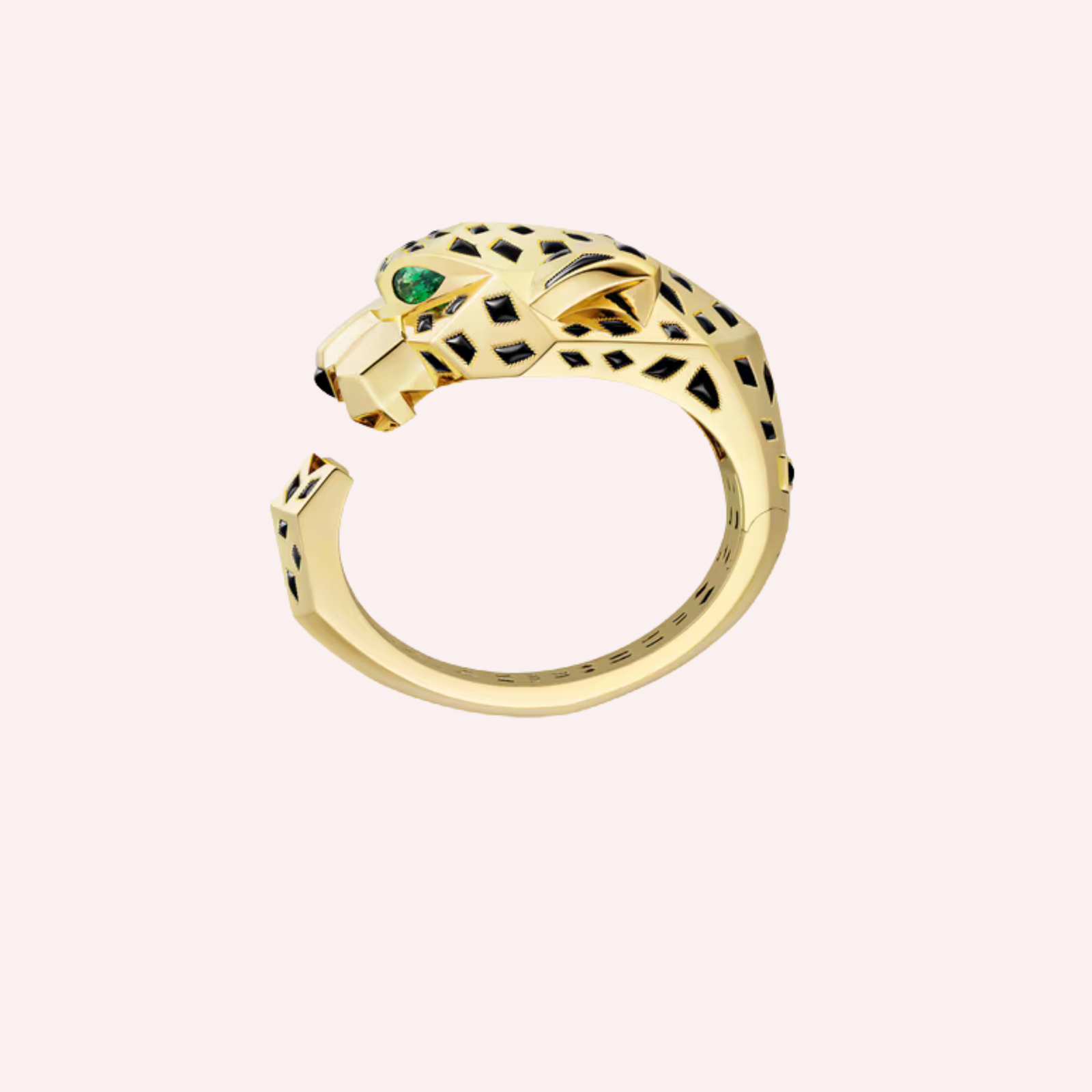 Crafted in 18K yellow gold (750/1000), this striking cuff bracelet is defined by polished onyx accents that sculpt the panther’s form with graphic intensity. The panther’s gaze is brought to life with two vivid tsavorite garnets, adding a refined burst of color and expressive character. Powerful yet elegant, this creation reflects Cartier’s mastery of form, symbolism, and precious materials.