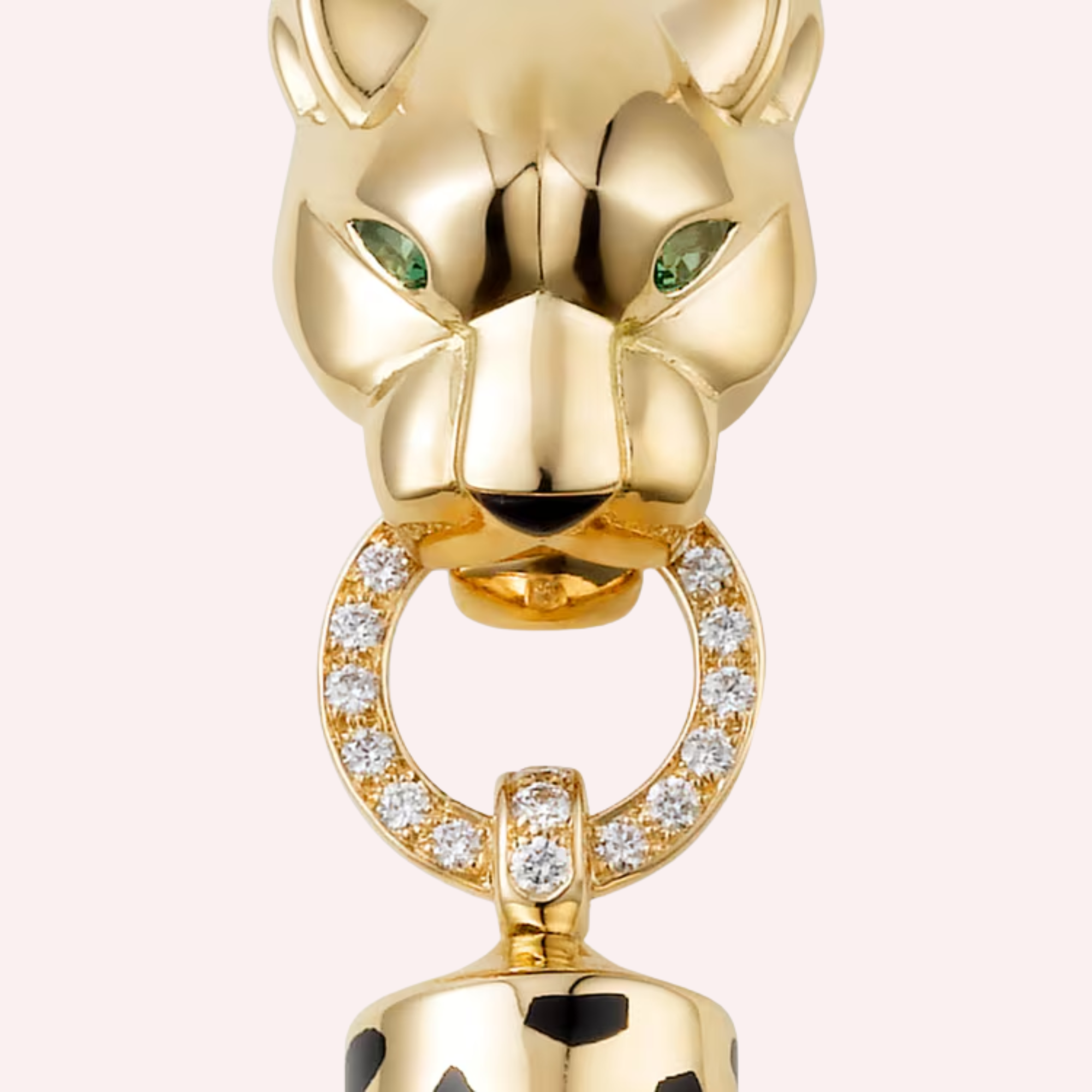 Crafted in radiant 18K yellow gold (750/1000), this elegant long necklace is accented with bold black lacquer and sculptural onyx details that define the panther’s expressive silhouette. The eyes are set with two vivid tsavorite garnets, while 36 brilliant-cut diamonds totaling 0.24 carat add refined sparkle. The elongated motif measures 54.7 mm in length and 11.3 mm in width, creating a graceful yet commanding presence that embodies the timeless allure and confident sophistication of Panthère de Cartier.