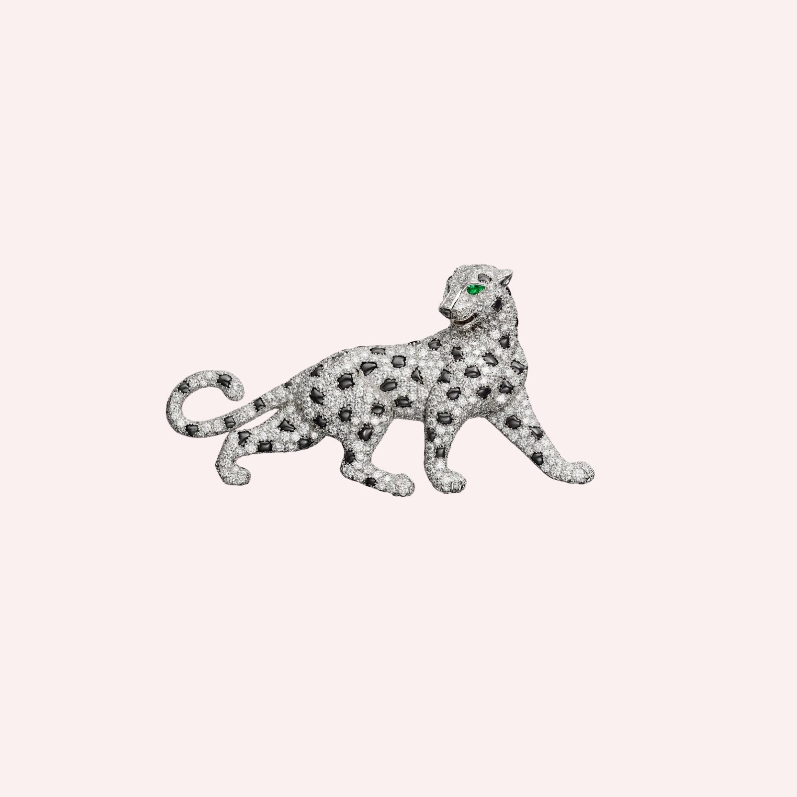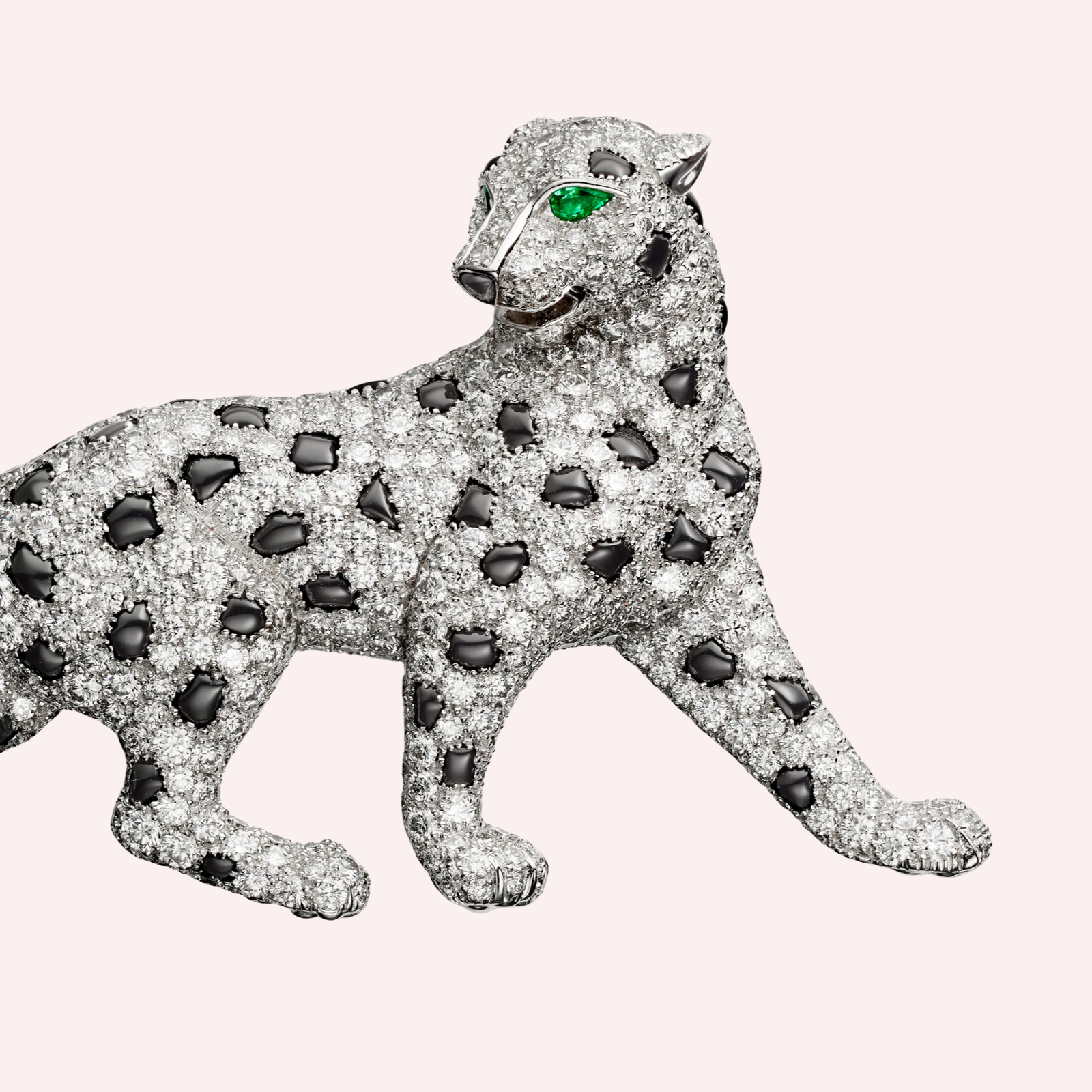 An iconic Pre-Owned Panthère de Cartier brooch in white gold, set with diamonds, onyx, and emerald eyes, showcasing timeless Cartier craftsmanship.