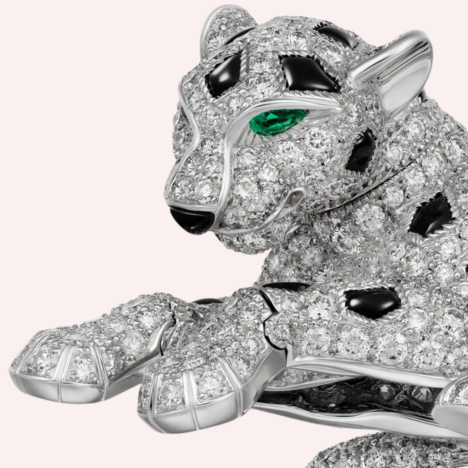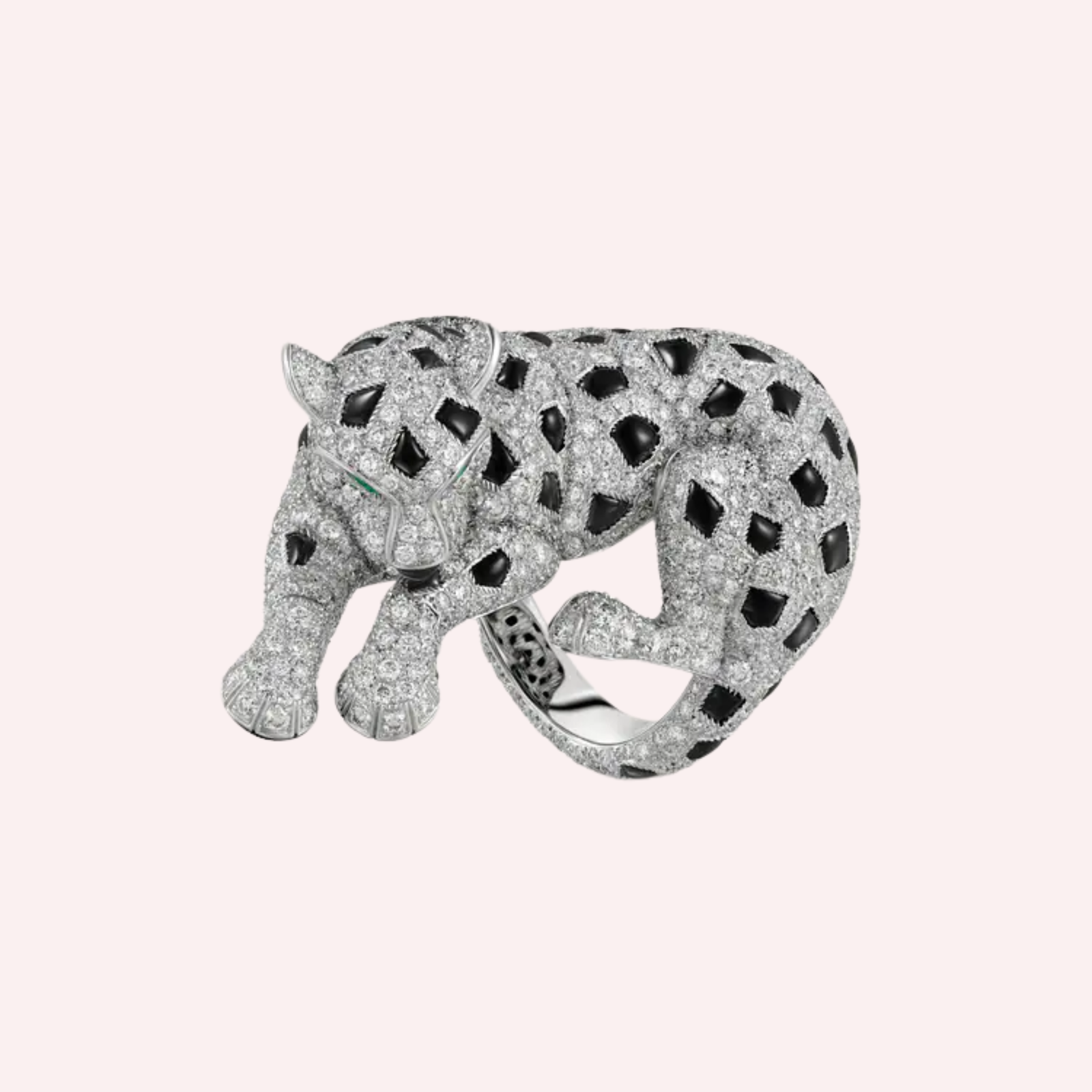 A Pre-Owned Panthère de Cartier pavé ring in 18K white gold, set with over 5 carats of diamonds, emerald accents, and onyx detailing.