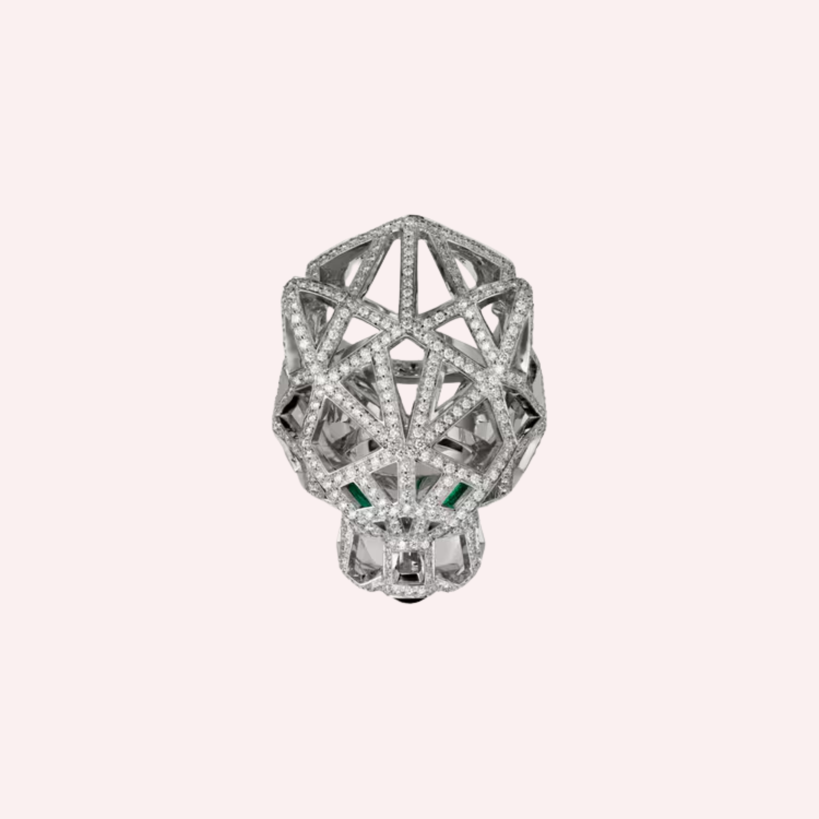 A Pre-Owned Panthère de Cartier pavé ring in 18K white gold with diamonds, emerald eyes, and onyx detailing in a bold sculptural design.