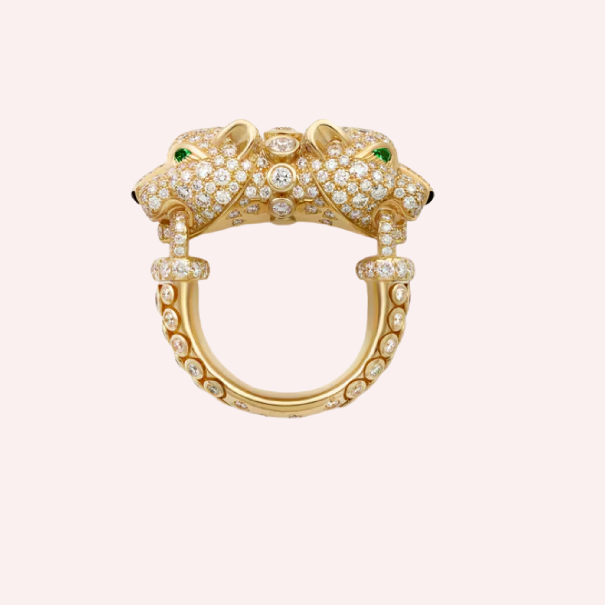 Crafted in 18K yellow gold (750/1000), this sculptural ring is set with 391 brilliant-cut diamonds totaling 3.76 carats (for size 52), delivering exceptional brilliance and refinement. The design is accented with sleek onyx details and four emeralds, bringing vivid contrast and expressive character to the panther motif. Measuring 29.5 mm in length and 12.2 mm in width, the ring is a striking statement of Cartier’s mastery of form and gemstone artistry.