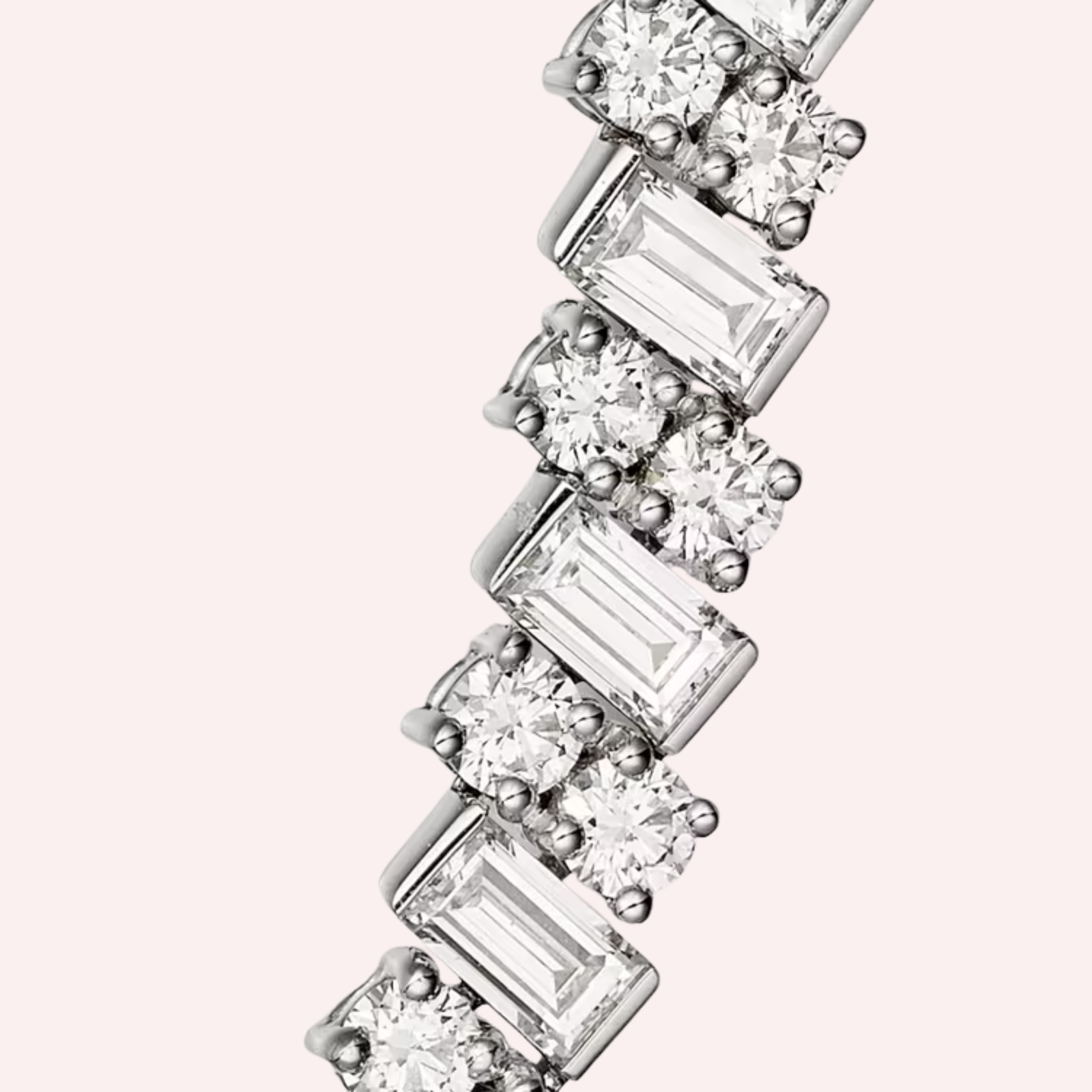 Crafted in 18K white gold (750/1000), this elegant necklace is set with 71 baguette-cut diamonds totaling 7.98 carats, complemented by 142 brilliant-cut diamonds totaling 6.77 carats. The harmonious contrast between geometric and round diamonds enhances depth, movement, and radiance, resulting in a refined silhouette that exemplifies modern sophistication and exceptional craftsmanship.