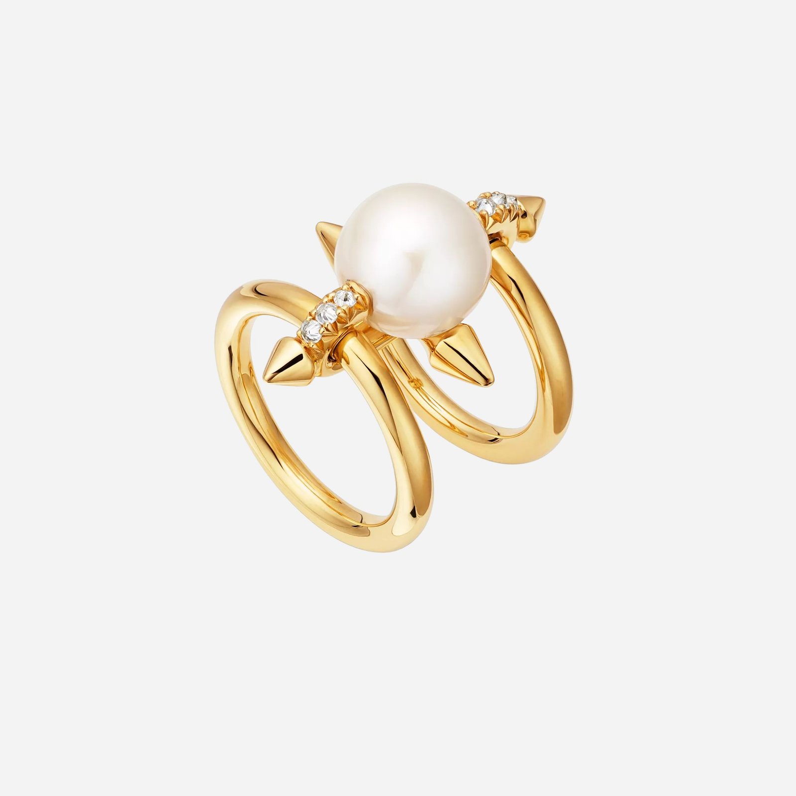 Expertly crafted in 18K yellow gold, this distinctive ring features a large-scale freshwater pearl at its center, framed by angular spear-shaped motifs on each side. Pavé diamonds are reverse-set to allow light to enter from every angle, maximizing their brilliance and adding radiant contrast to the luminous pearl. The innovative design incorporates individual bands that move effortlessly with the hand, creating a dynamic balance of artistry, comfort, and contemporary elegance.